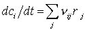 Formalkinetische Behandlung der k. R. Die kinetische Behandlung erfordert die mathematische Beschreibung der zeitlichen Änderung der Konzentrationen c1 sämtlicher Ausgangs-, Zwischen- und Endstoffe i, die sich aus der Summe bzw. Differenz ihrer Bildungs- bzw. Verbrauchsgeschwindigkeiten in allen Teilschritten j ergibt, an denen sie beteiligt sind, d. h., es gilt
