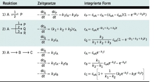 Dabei ist νij der stöchiometrische Faktor für den Stoff i in der j. Reaktion, τj die Geschwindigkeit der j. Reaktion. νij ist positiv, wenn der Stoff gebildet, negativ, wenn er verbraucht wird. Für k. R. resultieren komplizierte, meist nichtlineare Differentialgleichungssysteme, die nur in den einfachsten Fällen (z. B. wenn alle Teilschritte 1. Ordnung sind) geschlossen lösbar sind. Einige besonders einfache Fälle sind in der Tab. zusammengestellt. Ist eine geschlossene Lösung nicht möglich, müssen die Gleichungssysteme schrittweise numerisch integriert werden (kinetische Modellierung).