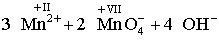 Komproportionierung, Synproportionierung, Redoxreaktionen, wobei ein Element aus einer höheren und einer tieferen in eine mittlere Oxidationszahl übergeht. Typische Beispiele für K. sind die Reaktion von Permanganat- mit Mangan(II)-Ionen zu Mangan(IV)-oxid gemäß