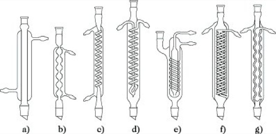 Kühler. Abb. 1: Im Labor verwendete Kühler: (a) Liebig-Kühler, (b) Kugelkühler, (c) Schlangenkühler, (d) Dimroth-Kühler, (e) Spiralkühler, (f) Doppelspiralkühler, (g) Wellrohrkühler.