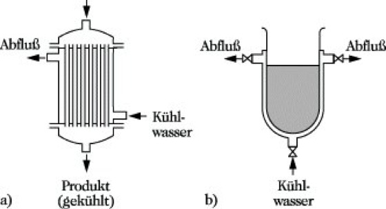 Kühler in der chem. Industrie. Hier wird eine Vielzahl von Kühlerbauformen angewendet. Generell handelt es sich um spezielle Apparate aus Metall. Diese K. können geschlossene Apparate bzw. Behälter sein, z. B.. Rohrbündelkühler (Abb. 2a), Tauchkühler, Mantelkühler (Abb. 2b) oder Rieselkühler. Besondere Bauarten für bestimmte chemisch-technologische Verfahren sind der Kratz-Kühler und der Spaltgaskühler.
