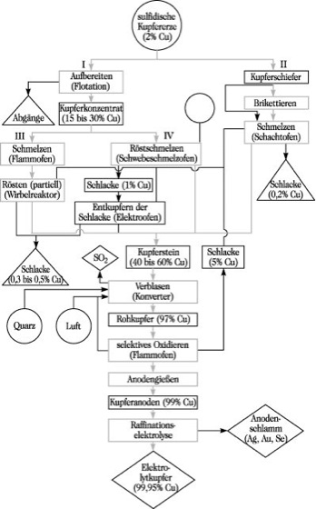 Kupfer. Abb.1: Schema pyrometallurgischer Verarbeitungsvarianten für sulfidische Kupfererze und -konzentrate. I flotierbare Kupfererze, II nicht flotierbare Kupfererze, III Standardverfahren, IV Röstschmelzverfahren.