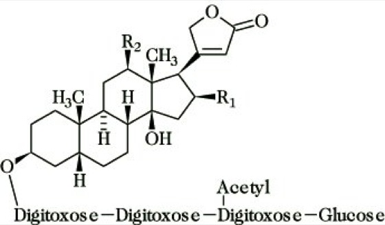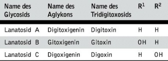 Die wichtigsten Verbindungen enthält die Tab. Zum Unterschied von den Purpureaglycosiden enthalten die primären L. (Lanatoside) eine Acetylgruppe am äußeren Digitoxoserest und kristallisieren besser. Enzymatisch kann der endständige Glucoserest leicht unter Bildung der Sekundärglycoside abgespalten werden. Meist wird das Glycosidgemisch durch zusätzliche milde alkalische Verseifung (Abspaltung der Acetylgruppe) zu den Tridigitoxosiden aufgearbeitet, von denen Digoxin die größte therapeutische Bedeutung besitzt. Bedeutung hat auch das Lanatosid C, das allerdings schwerer als Digoxin resorbiert wird. Über Wirkung Purpureaglycoside.