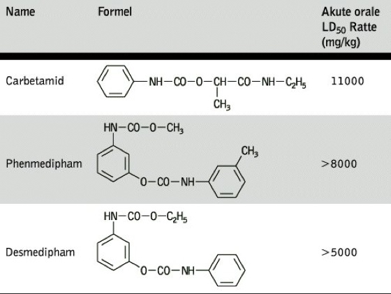 N-Phenylcarbamatherbizide, werden von der Carbamidsäure abgeleitet (Tab.). Während das Carbetamid ein typisches Bodenherbizid ist und vorwiegend in Rapskulturen im Nachauflaufverfahren eingesetzt wird, werden die wichtigen Rübenherbizide Phenmedipham und Desmedipham über die Blätter aufgenommen.