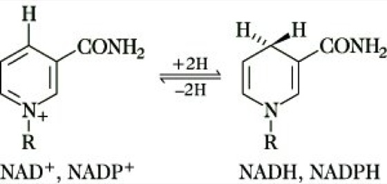 Nicotinamidnucleotide, eine Gruppe von Coenzymen wasserstoffübertragender Enzyme (Oxidoreductasen). Die N. enthalten als biochemisch reaktive Gruppe Nicotinsäureamid, an dessen heterocyclischem N-Atom ein mit Phosphorsäure oder Phosphorsäureestern veresterter Riboserest sitzt. In der oxidierten Form liegen die N. als Pyridinium-, in der reduzierten Form als Dihydropyridinverbindungen vor. Beide Formen unterscheiden sich deutlich in ihren Absorptionsspektren, was beim optischen Test zur Bestimmung von Enzymaktivitäten ausgenutzt wird. Zu den N. gehören Nicotinamid-mononucleotid (Abk. NMN), Nicotinamid-adenin-dinucleotid (Abk. NAD, veraltete Bezeichnung Diphospho-pyridinnucleotid, Abk. DPN) und Nicotinamid-adenin-dinucleotidphosphat (Abk. NADP, veraltete Bezeichnung Triphospho-pyridinnucleotid, Abk. TPN). NADPH wird im Stoffwechsel für reduktive Synthesen benötigt. Die Wasserstoffübertragung erfolgt stereospezifisch. Nach der Seite, von der sich das Substrat dem planaren Pyridinring nähert, werden A- und B-Enzyme innerhalb der NAD- bzw. NADP-abhängigen Enzyme unterschieden.