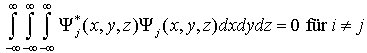 Orthogonalität, in der Quantenmechanik die Eigenschaft von Wellenfunktionen, daß die Integration des Produktes Ψj*(x,y,z) Ψj(x,y,z) (quantenmechanisches Atommodell) über den gesamten Raum Null ergibt, d. h., das Überlappungsintegral Sij der beiden Funktionen wird Null (verschwindet). Mathematisch wird die O. in der Form angegeben: