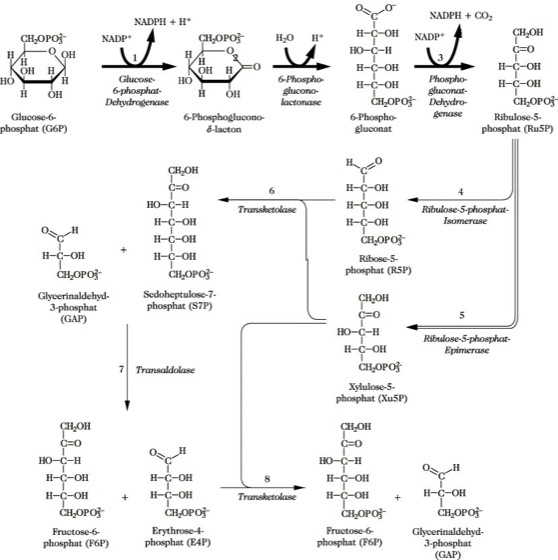 Pentosephosphat-Cyclus, Phosphogluconat-Weg, Warburg-Dickens-Horecker-Cyclus, ein Sekundärweg der Glucoseoxidation, der Pentosephosphate und Reduktionsäquivalente in Form von NADPH + H+ für die Biosynthese von Fettsäuren liefert. Im oxidativen Teil des P. wird Glucose-6-phosphat durch die Glucose-6-phosphat-Dehydrogenase zum 6-Phosphoglucono-δ-lacton dehydriert, das unter Katalyse der Lactonase 6-Phosphogluconat als Substrat für die 6-Phosphogluconat-Dehydrogenase liefert. Das unter Decarboxylierung resultierende D-Ribulose-5-phosphat wird durch die Phosphopentose-Isomerase in D-Ribose-5-phosphat als Vorstufe für die Nucleotidsynthese überführt. Bei Säugetieren ist der P. vor allem im Fettgewebe, in den Milchdrüsen, in er Nebennierenrinde und Leber lokalisiert, da die bei beiden Dehydrogenasereaktionen gebildeten zwei Moleküle NADPH + H+ für die Fettsäurebiosynthese benötigt werden. Im nichtoxidativen Teil des P. wird das Pentosephosphat über Zuckerphosphatintermediate mit 3, 4, 5, 6 und 7 C-Atomen schließlich in Fructose-6-phosphat und Glycerinaldehyd-3-phosphat überführt, die über die Glycolyse erneut in den P. eingeschleust werden können. Alle Reaktionen sind leicht reversibel (Abb.) und ermöglichen die Umwandlung von Hexosephosphaten zu Pentosephosphaten.