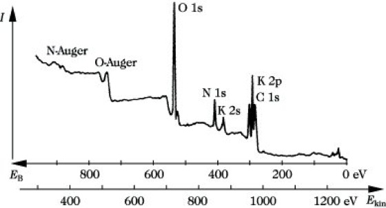 Photoelektronenspektroskopie. Abb.: Übersichtsspektrum von Kaliumnitrat KNO3 (Anregung mit Mg-Kα-Strahlung).