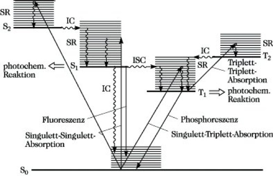 photophysikalische Prozesse. Abb.: Jablonski-Diagramm: photophysikalische Prozesse eines Moleküls. → Strahlungsprozesse, → strahlungslose Prozesse.