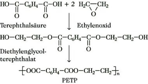 Polyethylenglycolterephthalat, Abk. PETP, --[OOC- C6H4-COO-CH2-CH2-]n, ein linearer Polyester, der durch Umsetzung von Terephthalsäure mit Ethylenoxid oder Umesterung von Dimethylterephthalat mit Ethylenglycol und anschließende Polykondensation hergestellt wird.