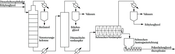 Herstellung. Die Umesterung von Dimethylterephthalat mit Ethylenglycol erfolgt in zwei Stufen. Beim diskontinuierlichen Verfahren wird das aufgeschmolzene Dimethylterephthalat mit Ethylenglycol in einem Rührreaktor bei etwa 100 °C in Gegenwart von Katalysatoren (Alkoholate oder Acetate des Zinks, Magnesiums, Lithiums u. a.) zu einem Polyestervorkondensat umgesetzt. Das entstehende Methanol und das überschüssige Ethylenglycol werden abdestilliert. In der zweiten Stufe wird das Polyestervorkondensat bei einer Temperatur von 250 bis 280 °C unter Vakuum zum P. polykondensiert. Als Kettenbrecher wird eine monofunktionelle Carbonsäure (z. B. Benzoesäure) zugegeben. Beim kontinuierlichen Verfahren (Abb.) erfolgt die Umesterung des Dimethylterephthalats zum Diglycolterephthalat in einer Kolonne, wobei das Methanol über Kopf abdestilliert. Anschließend wird das überschüssige Ethylenglycol unter Vakuum in einem Dünnschichtverdampfer abgetrieben. Das ethylenglycolfreie Vorkondensat wird im Schneckenverdampfer bei etwa 280 °C unter Vakuum polykondensiert. Ein sehr reines P. kann durch Umsetzung von Terephthalsäure mit Ethylenoxid zu Diethylenglycolterephthalat erhalten werden, das in einer zweiten Stufe zu P. polykondensiert wird.