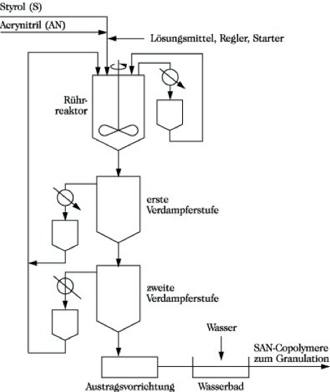 Die größte Bedeutung unter den Copolymeren des Styrols haben die SAN-Copolymere. Bei der Herstellung durch die Lösungspolymerisation (Abb. 2) werden Styrol und Acrylnitril bei 80 bis 160 °C in Gegenwart eines Lösungsmittels, Kettenreglers und Starters im Rührreaktor kontinuierlich copolymerisiert. Die Polymerisationswärme wird durch Verdampfen von Lösungsmittel und Ausgangsmonomeren abgeführt. In zwei nachgeschalteten Verdampferstufen wird das SAN-Copolymere vom Lösungsmittel sowie nicht umgesetzten Monomeren befreit und einer Austragsvorrichtung zugeführt. Die nicht umgesetzten Monomeren und das Lösungsmittel werden in den Polymerisationsreaktor zurückgeführt.