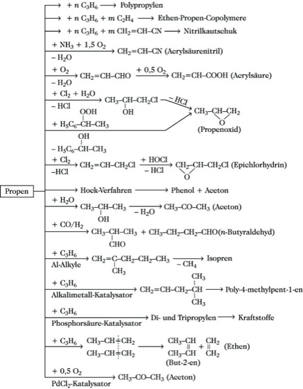 Propen, Propylen, CH3-CH=CH2, ein Kohlenwasserstoff der Alkenreihe. P. ist ein farbloses, brennbares Gas; F. -185,3 °C, Kp. -47,7 °C. Es läßt sich bei Normaltemperatur bei Druckerhöhung auf etwa 8·105 Pa verflüssigen. In Wasser ist P. schwer, in Ethanol und Ether leicht löslich. Es verbrennt mit gelber, rußender Flamme. P. ist sehr reaktionsfähig und zahlreichen Additionsreaktionen zugänglich (Abb. 1).