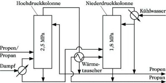Herstellung. P. wird ausschließlich als Nebenprodukt bei der Ethenerzeugung (Pyrolyse) und bei einigen Raffinerieprozessen, insbesondere beim katalytischen Cracken, gewonnen. Bei der Aufarbeitung des Pyrolysegases fällt eine C3-Fraktion an, die im wesentlichen P., Propan, Propin und Allen enthält. Die Entfernung von Propin und Allen erfolgt durch selektive Hydrierung zu P. Danach wird das Gemisch von Propan und P. destillativ aufgearbeitet. Die Trennung erfolgt zweckmäßigerweise nach dem Doppelsäulenverfahren oder nach dem Wärmepumpenverfahren. Beim Doppelsäulenverfahren wird der Druck in der ersten Kolonne so gewählt, daß die Brüden als Heizmedium für die zweite Kolonne benutzt werden können (Abb. 2).