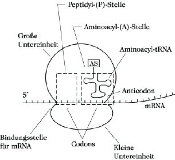Biosynthese. Hierbei werden freie Aminosäuren des Zellbereichs in genetisch determinierter Reihenfolge peptidartig miteinander verknüpft. An der Synthese sind als Matrize dienende Messenger-RNA (mRNA), die die Aminosäuren esterartig bindenden und transportierenden Transfer-RNA (tRNA), die in den Ribosomenuntereinheiten lokalisierten ribosomalen rRNA, eine Reihe spezifischer Ribosomenproteine und -enzyme, verschiedene niedermolekulare Cofaktoren sowie ATP (Adenosin-5'-triphosphat) und GTP (Guanosin-5'-triphosphat) als Energielieferanten kooperativ beteiligt. Die Biosynthese beginnt im Zellkern mit der Kopie einer mRNA, wobei eine entsprechende chromosomale DNA als Matrize fungiert (Transcription). Die gebildete mRNA wandert in das Cytoplasma und dient hier, an das Ribosom einer Polysomenkette des endoplasmatischen Reticulums gebunden, als Matrize für den Aufbau der Polypeptidketten (Translation). Die Ribosomen bestehen aus einer großen und kleinen Untereinheit mit spezifischen Bindungsstellen für die anzubauenden Aminosäuren und die wachsende Peptidkette. Die mRNA bewegt sich in einer "Spurrinne" zwischen den beiden Untereinheiten (Abb. 3).