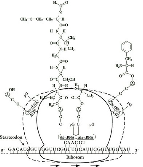 Die für die Peptidverknüpfung erforderliche Aktivierung der Aminosäuren erfolgt durch kovalente Bindung an hochspezifische tRNA-Moleküle. Es entstehen "aktivierte Ester" mit hohem Gruppenübertragungspotential, die als Aminoacyl-tRNA an die entsprechende Bindungsstelle transportiert und angelagert werden. Als Initiatoraminosäure fungiert bei der Synthese in E. coli das durch das Nucleotidtriplett AUG codierte Methionin, das als Formylmethionyl-tRNA gebunden wird. Die Knüpfung der ersten Peptidbindung erfolgt nach Anlagerung der zweiten Aminoacyl-tRNA durch nucleophilen Angriff der Aminogruppe auf die Esterbindung der benachbarten Formyl-Met-tRNA. Durch Weitertransport der entstandenen Dipeptidyl-tRNA um die Länge eines Codetripletts wird der Akzeptorort für die nachfolgende Anknüpfung freigegebenen (Abb. 4, S 113.). Stop-Codons geben das Signal für das Ende einer Synthese. Andere Signalsequenzen regulieren spezifische Synthesewege, z. B. die lokalspezifische Bildung von P., die die Zelle über Kanalsysteme des endoplasmatischen Reticulums verlassen sollen (Sekretproteine). Die Signalcodons folgen unmittelbar auf das Startcodon AUG. Der größte Teil der synthetisierten P. verläßt das Ribosom in biologisch aktiver Form. Die Abtrennung des Startmethionins und der Signalpeptide erfolgt auf enzymatischem Wege. Eine Reihe von P. wird im Anschluß an die Synthese durch Hydroxylierung, Methylierung, Prenylierung oder Phosphorylierung modifiziert ("Processing") oder an Nichtproteinkomponenten gebunden.