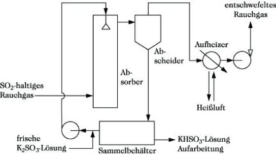 Rauchgasentschwefelung. Abb.: Rauchgasentschwefelung durch Gaswäsche mit Kaliumsulfitlösung.