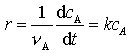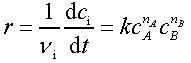 . Hierbei sind νi stöchiometrische Faktoren, die für Ausgangsstoffe negatives Vorzeichen und für Produkte positives Vorzeichen haben, ci die Konzentration der Komponenten i und t die Zeit.