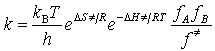 erhält man für die Geschwindigkeitskonstante k = (kBT/h)eΔS =| /R e-ΔH =| /RT (Eyring-Gleichung). Hierbei sind ΔS=| die Aktivierungsentropie und ΔH=| die Aktivierungsenthalpie. Außerdem kann K=| mit Hilfe der Zustandssummen der statistischen Thermodynamik formuliert werden. Für eine bimolekulare Reaktion ergibt sich