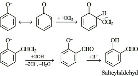 Reimer-Tiemann-Reaktion, eine erstmals 1876 beschriebene Aldehydsynthese, bei der Phenole mit Chloroform und wäßriger Alkalihydroxidlösung regioselektiv in 2-Position umgesetzt werden. Aus Phenol selbst erhält man Salicylaldehyd in 60%iger Ausbeute. Bei dieser Reaktion tritt intermediär Dichlorcarben auf, das sich elektrophil an das ambidente Phenolat-Ion anlagert. Ist im Phenolringsystem eine 2-Position besetzt, wird die Formylgruppe