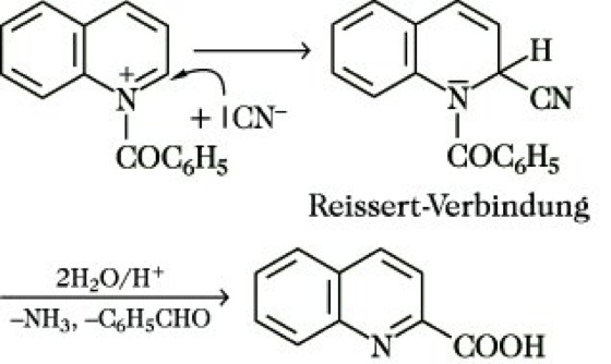 Reissert-Verbindungen, organische Verbindungen, die man durch Addition von Cyanid-Ionen an N-Benzoylchinoliniumchlorid erhält. Die R. zerfallen bei der Hydrolyse in Chinaldinsäuren (Chinolin-2-carbonsäure) und Benzaldehyd: