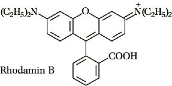 Rhodaminfarbstoffe, eine Gruppe von Xanthenfarbstoffen, die durch Kondensation von substituierten 3-Aminophenolen mit Phthalsäureanhydrid zugänglich sind. Ein typischer Vertreter ist das Rhodamin B (Abb.), das grüne Kristalle oder ein rotviolettes Pulver bildet.