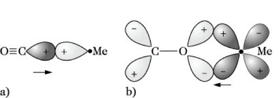 Rückbindung. Abb.: Bindungsvorstellung in Metallcarbonylen: (a) Donorbindung, (b)b Rückbindung.
