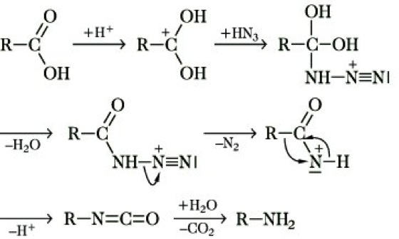 Dabei erfolgt wie beim Curtius-Abbau, Hofmann-Abbau von Säureamiden und Lossen-Abbau eine Verkürzung der Kohlenstoffkette um ein C-Atom. Bei der S. ergeben Dicarbonsäuren mit mehr als einer CH2-Gruppe zwischen den Carboxygruppen entsprechende Diamine, Aldehyde liefern Nitrile und N-substituierte Formamide, aus Ketonen entstehen Säureamide. Aus cyclischen Ketonen erhält man Lactame bzw. bei einem großen Überschuß von Stickstoffwasserstoffsäure substituierte Tetrazole. Aliphatische und alicyclische Carbonylverbindungen reagieren leichter als aromatische Verbindungen und als Carbonsäuren. Daher kann die S. bei Anwesenheit verschieden reaktiver Carbonylgruppen in einem Molekül auch selektiv ausgeführt werden.