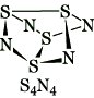 Schwefelnitride, Schwefel-Stickstoff-Verbindungen. Der wichtigste Vertreter ist Tetraschwefeltetranitrid, S4N4 orangegelbe, monokline Kristalle; D. 2,22 g cm-3, Sbp. 179 °C. S4N4 ist endotherm und zerfällt oberhalb 160 °C oder auch bei Stoß bzw. Schlag explosionsartig in seine Bestandteile: S4N4 → 4/8 S8 + 2 N2, ΔH = -533,9 kJ/mol. Es bildet käfigartige Moleküle in denen alle S-N-Bindungen äquidistant sind. Zinn(II)-chlorid in Ethanol reduziert S4N4 zu Tetraschwefeltetraimid (-NH-S-)4.