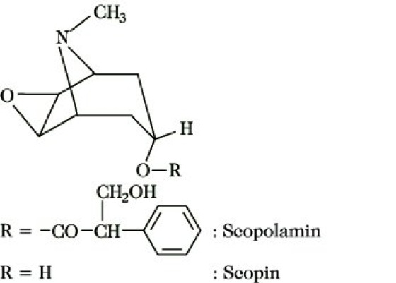 Scopolamin, Hyoscin, ein Esteralkaloid, bei dem die OH-Gruppe des Scopins mit der Carboxygruppe der S-Tropasäure verestert ist. Als Esteralkaloid ist S. leicht hydrolytisch spaltbar, wobei das primäre Spaltprodukt Scopin unter Beteiligung der OH-Gruppe und des Oxiranringes weiterreagiert. S. kommt zu einem hohen Prozentsatz in australischen Duboisia-Arten vor. Therapeutisch verwendet wird das Hydrobromid.