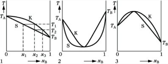 Siedediagramm. Abb. 1 bis 3: Typen von Siedediagrammen.