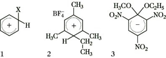 σ-Komplex, Intermediat bei der elektrophilen und nucleophilen Substitution der Arene. Bei der elektrophilen aromatischen Substitution ist der σ-K. ein Arenium-Ion mit koordinativ dreiwertigem Kohlenstoff, in dem n π-Elektronen über (n + 1) C-Atome delokalisiert sind (1). Die Bildung eines σ-K. ist im allg. der geschwindigkeitsbestimmende Schritt bei der elektrophilen aromatischen Substitution. Durch Elektronenpaardonorsubstituenten wird ein σ-K. in jedem Fall stabilisiert, durch Elektronenpaarakzeptorsubstituenten destabilisiert. Unter besonderen Bedingungen können relativ stabile σ-K. isoliert werden, z. B. bei der Alkylierung von Mesitylen mit Fluorethan/Bortrifluorid bei -80 °C (2).