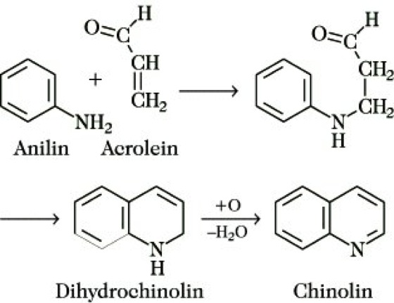 Skraup-Synthese, Synthese von Chinolinen aus einem primären aromatischen Amin, z. B. Anilin, Glycerin, konz. Schwefelsäure und einem Oxidationsmittel, wie Nitrobenzol und Eisen(III)-Verbindungen. In einer ersten Reaktionsstufe entsteht aus Glycerin Acrolein, an dessen Doppelbindung sich das Amin addiert. Nach erfolgtem Ringschluß (elektrophile Substitution über die Formylgruppe) und Wassereliminierung zum Dihydrochinolin erfolgt die oxidative Dehydrierung zum Endprodukt: