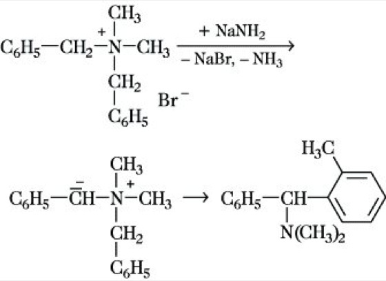 Sommelet-Umlagerung, Umlagerung quartärer Ammoniumsalze mit einem oder zwei Benzylresten zu tertiären Aminen bei Einwirkung von Natriumamid in flüssigem Ammoniak oder Phenyllithium.