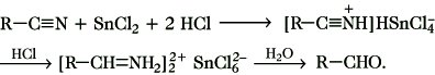 Für den Mechanismus der Reaktion wird angenommen, daß sich zuerst die Tetrachlorozinn(II)-säure bildet, die mit dem Nitril ein Addukt ergibt. Reduktion zum Aldimin und dessen Hydrolyse sind die Folgeschritte. Dabei kann in einigen Fällen Hexachlorostannat(IV) des Aldimins in kristalliner Form isoliert werden. Die S. hat den Vorteil, daß die Reaktion auf der Stufe des Aldehyds stehen bleibt. Im Gegensatz dazu reduziert Lithiumaluminiumhydrid leicht weiter bis zum Alkohol, insbesondere, wenn ein Überschuß verwendet wird.