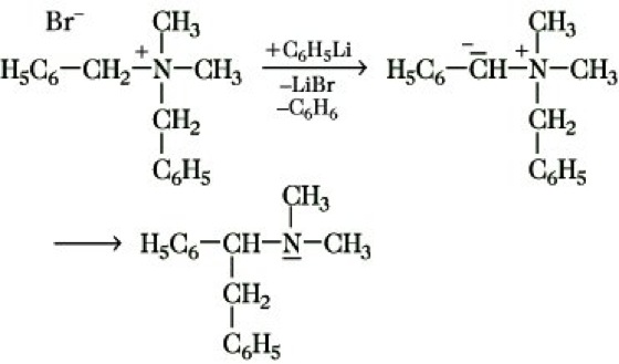 Stevens-Umlagerung, Umlagerung quartärer Ammoniumsalze mit einem oder zwei Benzylresten oder auch einem Arylrest zu tertiären Aminen bei Einwirkung von Phenyllithium oder Natriumamid als Protonenakzeptoren. Aus dem Salz entsteht über ein Ylid, das die Umlagerung erfährt, das tertiäre Amin. Dabei löst sich im zwitterionischen Ylidmolekül ein Benzyl-Kation vom N-Atom und wandert zur Carbanionenposition unter Neuknüpfung einer C-C-Bindung.
