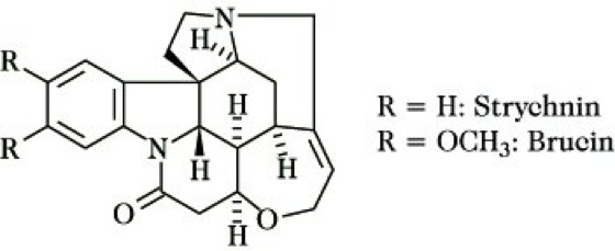 Strychnin, ein monoterpenoides Indolalkaloid, das zusammen mit Brucin Hauptinhaltsstoff der Samen und anderer Pflanzenteile des in Südostasien heimischen Baumes Strychnos nux-vomica ist. Die Biosynthese erfolgt aus Tryptophan und einem Monoterpen.
