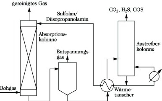 Sulfinol-Verfahren. Abb.: Schema einer Gasreinigungsanlage.