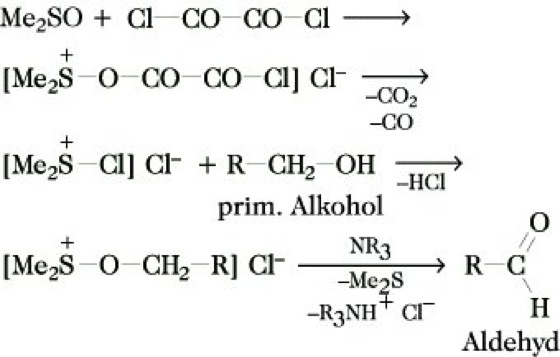Swern-Oxidation, eine seit 1981 bekannte Methode zur definierten Oxidation von primären Alkoholen zu Aldehyden. Dabei wird Dimethylsulfoxid mit Oxalylchlorid zu einem Reagens umgesetzt, das mit
