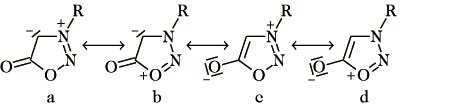 Die Grenzstruktur (c) ist aufgrund von ESCA-Messungen die wahrscheinlichste. S. sind durch Dehydratisierung von N-substituierten N-Nitrosoglycinen zugänglich, so entsteht der Grundkörper der S., 3-Phenyl-1,2,3-oxadiazol-5-on, bei der Einwirkung von salpetriger Säure auf Anilinoessigsäure über das entsprechende Nitrosamin. S. sind sehr reaktionsfähig und lassen sich in zahlreiche andere Heterocyclen überführen.