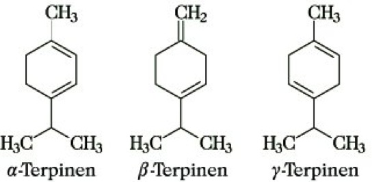 β-T. kommt selten vor. α-T. ist ein farbloses Öl mit zitronenähnlichem Geruch; Kp. 180 bis 182 °C. Bei der Behandlung mit Salzsäure entsteht Terpinendihydrochlorid.