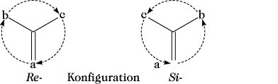 Zur Kennzeichnung enantiotoper Gruppen und Seiten verwendet man die Cahn-Ingold-Prelog-Konvention (CIP-Priorität; Stereoisomerie 1.1.). Eine enantiotope Gruppe oder Seite wird mit Re bezeichnet, wenn von ihr aus betrachtet die nach der Sequenzregel angeordneten restlichen drei Gruppen in der Reihenfolge a → b → c eine Drehung im Uhrzeigersinn ergeben, bei der Drehung gegen den Uhrzeigersinn nennt man sie Si (Abb. 4).