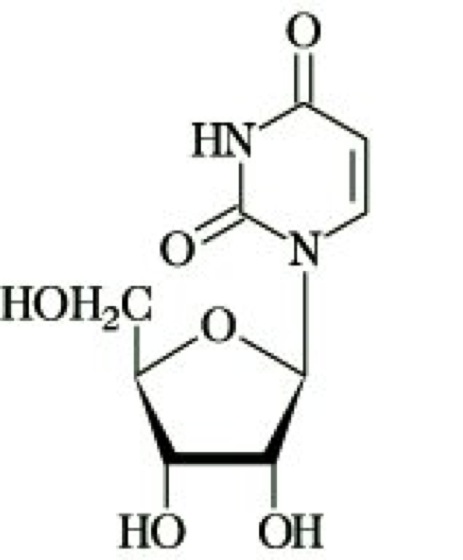 Uridin, Abk. Urd oder U, 1-β-D-Ribofuranosyluracil, ein Nucleosid, farblose Kristalle, Mr 244,2, F. 165 bis 168 °C, in Wasser löslich, in Ether praktisch unlöslich. U. ist Bestandteil der Ribonucleinsäuren. Die 5'-Nucleotide Uridinmonophosphat (UMP), Uridindiphosphat (UDP) und Uridintriphosphat (UTP) spielen eine wesentliche Rolle im Intermediärstoffwechsel (UDP als aktivierendes Coenzym von Glycosylierungsreaktionen, UTP als energiereiche Verbindung).