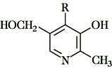 Vitamin B6, Pyridoxin, Pyridoxol, Adermin (R = CH2OH), 2-Methyl-3-hydroxy-4,5-di(hydroxymethyl)-pyridin, ein Vitamin, das zusammen mit Pyridoxal (R = CHO) und Pyridoxamin (R = CH2NH2)