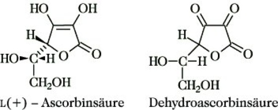 Vitamin C, Ascorbinsäure, ein wasserlösliches Vitamin mit der Struktur eines in der prototropen Endiolform vorliegenden 3-Oxo-L-gulonsäure-γ-lactons.