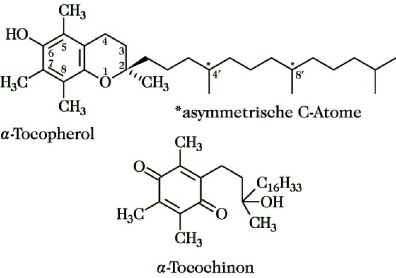 bei Ratten zeigt. Es hat 3 chirale C-Atome. Natürliches α-Tocopherol hat die Konfiguration 2R, 4'R und 8'R und zeigt Rechtsdrehung. Synthetisch kann es durch Kondensation von Trimethylhydrochinon mit Phytol gewonnen werden. Setzt man dafür natürliches Phytol ein, erhält man ein Epimerengemisch der Konfiguration 2RS, 4'R, 8'R. Wird synthetisches (±)-Phytol eingesetzt, erhält man totalracemisches Tocopherol. α-Tocopherol wird meist in Form des stabileren Acetats eingesetzt, bei dem die OH-Gruppe mit Essigsäure verestert ist. Es ist ein gelbliches Öl. V. E sind oxidationsempfindliche Substanzen, die leicht in Tocopheryl-p-chinone (Tocochinone) übergehen. Sie können deshalb als Antioxidanzien eingesetzt werden. Ihnen wird eine Abfangwirkung gegenüber freien Radikalen zugeschrieben.