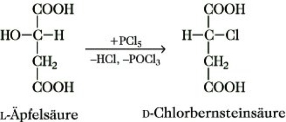 Walden-Umkehr, die Erscheinung, daß bei SN2-Reaktionen am asymmetrischen C-Atom Inversion der Konfiguration eintritt, die im allg. mit einer Umkehr der optischen Drehung verbunden ist. So entsteht z. B. bei der Umsetzung von (S)-(-)-Äpfelsäure (L-Äpfelsäure) mit Phosphor(V)-chlorid (R)-(+)-Chlorbernsteinsäure (D-Chlorbernsteinsäure):