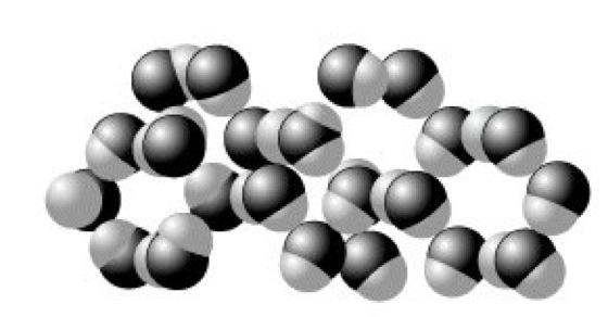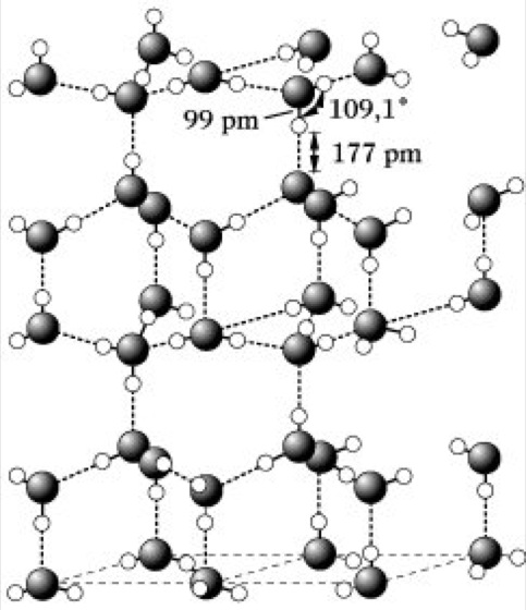 Bei Normaldruck kristallisiert W., von dem acht polymorphe Formen bekannt sind, hexagonal in einem dem Tridymit vergleichbaren Gitter (Abb. 1). Am Schmelzpunkt des Eises bricht diese relativ sperrige Struktur weitgehend zusammen, die Packungsdichte der H2O-Moleküle erhöht sich, womit ein Dichteanstieg beim Übergang in die flüssige Phase verbunden ist. Doch auch oberhalb des Schmelzpunktes sind Bruchstücke des Eisgitters erhalten, deren allmählicher Abbau mit steigender Temperatur bei gleichzeitiger Zunahme der Wärmebewegung der H2O-Moleküle das Dichtemaximum des W. bei 4 °C verursacht. Auch im flüssigen
