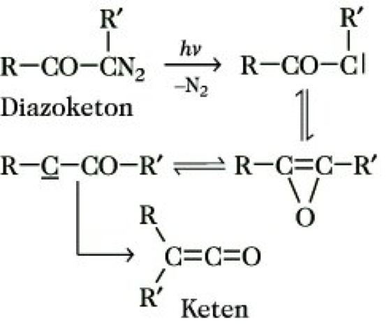 Wolff-Umlagerung, Umlagerung von α-Diazoketonen in Ketene, die weiteren Reaktionen, z. B. mit Wasser zu Carbonsäuren, mit Alkoholen zu Estern und mit Ammoniak zu Carbonsäureamiden, zugänglich sind. Die Umsetzung erfolgt durch Erwärmen in Gegenwart von Silberoxid; als Zwischenstoffe werden Ketocarbene angenommen, die durch anionotrope Wanderung des Substituenten R Keten bilden. In einigen Fällen konnten unter Ausschluß von Wasser und Alkoholen Ketene isoliert werden. Bei der photochemischen Umsetzung wird wahrscheinlich eine Oxiren-Zwischenstufe durchlaufen: