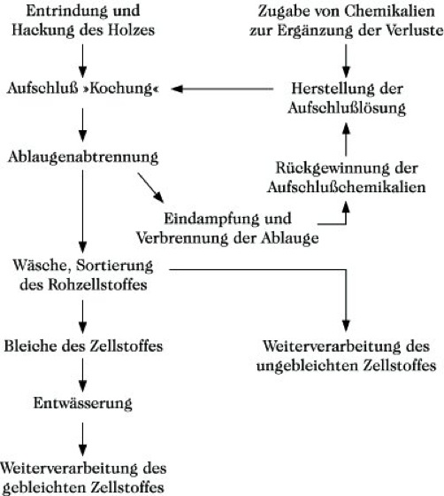 Zellstoff. Abb.: Verfahrensablauf bei der Zellstoffgewinnung (vereinfacht).